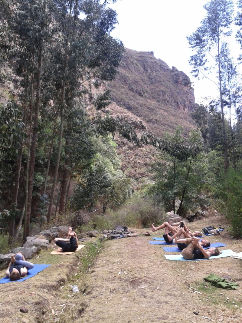 At the flat space next to the river Daya is giving his yoga class. It’s such great weather today, better hold class outside than inside Nidra Wasi, the local yoga school. It looks awesome, Daya and a little group of students, all in candle pose. A bit further on a girl is crossing the bridge. She’s balancing on the bridge: two logs next to each other, with a bucket in each hand. She gives me a big smile. I admire her balancing skills. Behind her is her mother with a baby on her back and even bigger buckets.